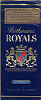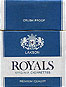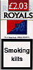 Royals King Size with print at cellophane - £ 2.03 Royals United Kingdom 2005 10 pieces with Filter in Flip Top Box with Cellophane Tar 10, Nicotine 0.8, Barcode 5000393037848, Price 2.03 £ Producer British American Tobacco Trade Mark Owner Rothmans of Pall Mall |