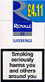 Royals Superkings 8mg with print at cellophane - £ 4.11 United Kingdom 2006 20 pieces with Filter in Flip Top Box with Cellophane Tar 8, Nicotine 0.8, Barcode 5000393038654, Price 4.11 £ Producer British American Tobacco Trade Mark Owner Rothmans of Pall Mall |