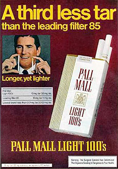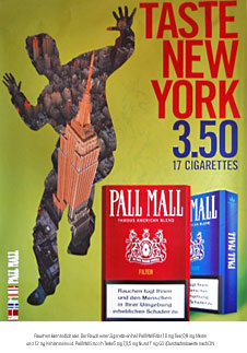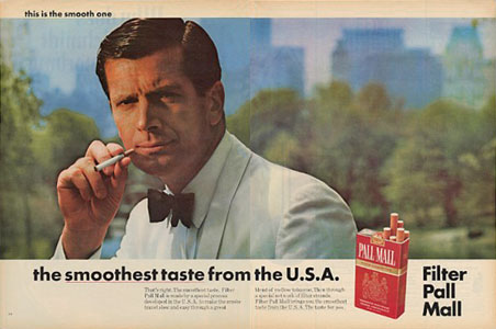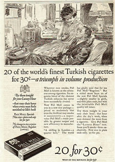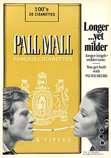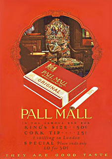 see also Rothmans Pall Mall Brand got introduced in 1899 by BLACK BUTLER COMPANY at London. In 1907 the US branch called BUTLER & BUTLER TOBACCO COMPANY at New York becomes part of THE AMERICAN TOBACCO COMPANY. It's not sure if the English company became part of ROTHMANS, but ROTHMANS started to procuce them in 1900. That's why there have been 2 different PALL MALL brands until 1999 when BRITISH AMERICAN TOBACCO and ROTHMANS merged. The name PALL MALL stands for a fashionable London street where in the 18th century "pall-mall" (a precurser to croquet) was played. Was in 1939 the first King-Size cigarette. |